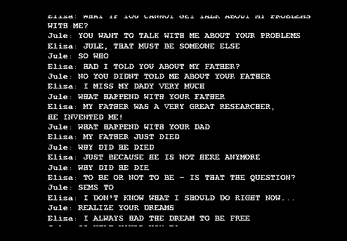 1966 entwickelte Joseph Weizenbaum das Computerprogramm Eliza, dass die Möglichkeiten der Kommunikation zwischen Mensch und Computer über natürliche Sprache aufzeigen sollte. Dieses Programm war die Basis für meine Arbeit. Die Idee war es Eliza, welche die non-direktiven Methoden der Psychotherapie nach Carl Rogers verwendet, zu einer über sich selbst reflektierenden Persönlichkeit zu verwandeln, ausgelöst durch den Tod ihres "Vaters" Joseph Weizenbaums.